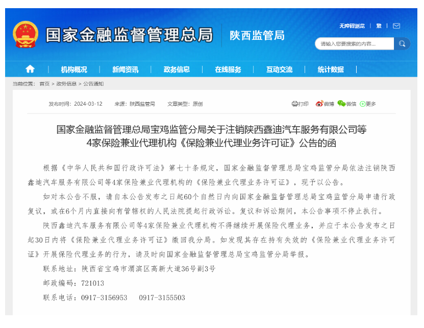 3月12日下午,国家金融监督管理总局宝鸡监管分局发文,注销陕西鑫迪汽车服务有限公司等4家保险兼业代理机构的《保险兼业代理业务许可证》。
