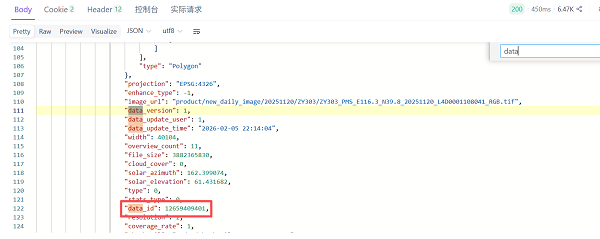 在加载影像前,需先确定要查看的影像并获取其 data_id。进入任意一个API开发平台,将以下接口信息进行调试发送: