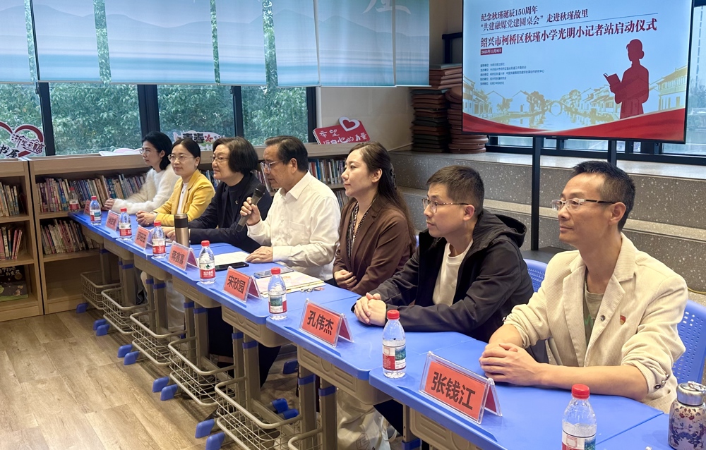绍兴市秋瑾研究会顾问、浙江农业商贸职业学院原党委书记邵田田,光明日报出版社《光明少年》杂志主编宋欣园,绍兴市柯桥区福全街道党工委委员孔伟杰,秋瑾小学校长张钱江,秋瑾小学办公室主任郑金娟,中国党建画院党建好故事创研中心浙江诗书画院副院长刘天明,中国党建画院党建好故事创作研究中心研究员王旻等领导专家代表、秋瑾小学30名光明小记者与家长等70多位代表出席了启动仪式。仪式由“共建融媒党建圆桌会”召集人、中国党建画院党建好故事创作研究中心主任、《社会与公益》杂志社副总编辑蒋鑫富主持。孔伟杰代表福全街道党工委首先致辞;秋瑾小学校长张钱江作主题发言。
