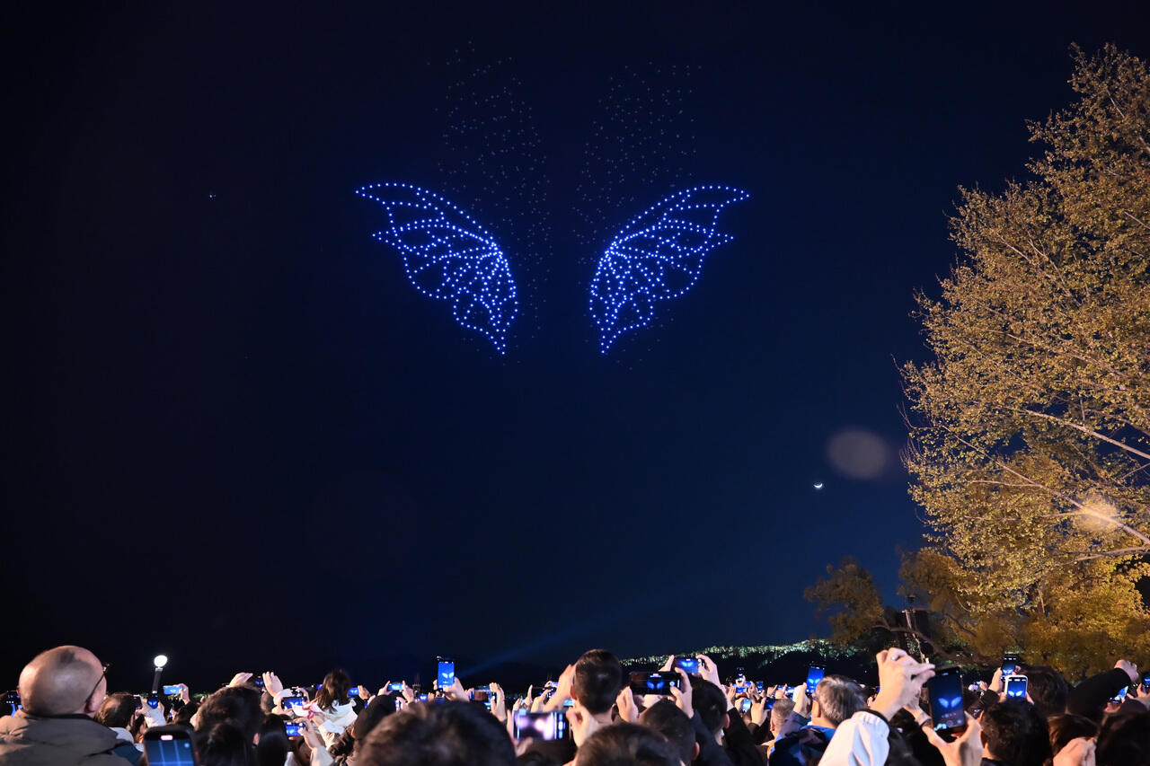 4月1日晚,杭州西湖音乐喷泉广场上演无人机表演。1500架无人机斑斓闪烁,在西湖上空不断变换队形组成各种图案,吸引市民和游客驻足观看。浙江日报 记者 董旭明 摄