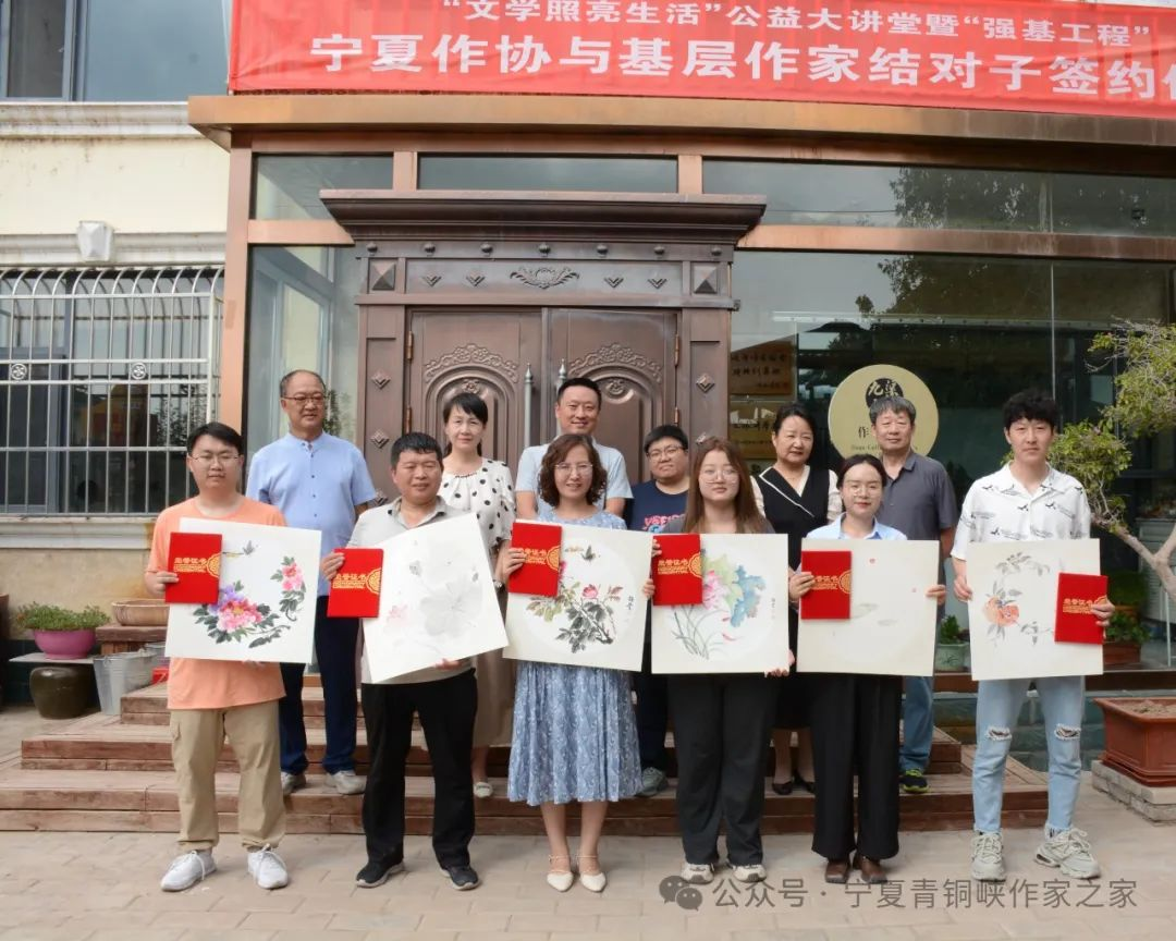 为发掘培养文学新人,唱响志愿服务主旋律,9月3日下午,青铜峡作家之家喜事连连。宁夏作协“文学照亮生活”公益大讲堂暨“强基工程”宁夏作协与基层作家结对子签约仪式,吴忠市作协、吴忠市评协为青铜峡作家之家“校园小作家”指导老师颁发文艺志愿者聘书,吴忠市评协“同心跟党走·书写新时代”——庆祝新中国成立75周年文学公益大讲堂,青铜峡作家之家第二期“青年作家读书创作”公益培训班结业表彰会暨第三期培训班开班仪式在作家之家圆满举办。宁夏作协副主席闫宏伟担任公益大讲堂主讲嘉宾。活动以线上线下形式举办。银川、吴忠、盐池、海原、中卫等地作家、文学爱好者近70人收听收看活动。