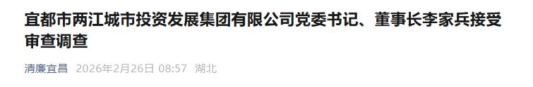 据宜都市纪委监委2月26日消息:宜都市两江城市投资发展集团有限公司党委书记、董事长李家兵涉嫌严重违纪违法,主动投案,目前正接受宜都市纪委监委纪律审查和监察调查。