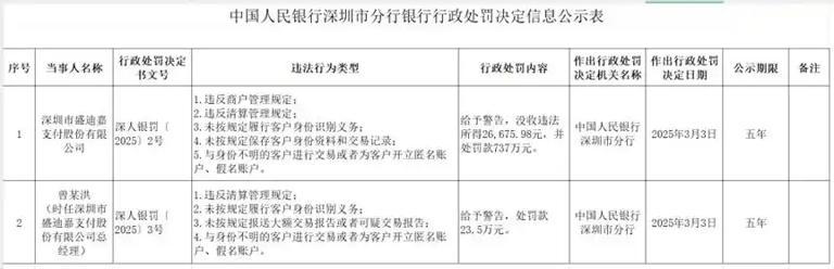 中国网财经3月12日讯 人民银行深圳市分行最新披露的一纸支付罚单,将广东盛迪嘉电子商务股份有限公司(简称“盛迪嘉支付”)推上风口浪尖。因存在“违反商户管理规定”等5项违法行为,盛迪嘉支付被罚737万元。同时,时任盛迪嘉支付总经理曾某洪被给予警告,并处罚款23.5万元。