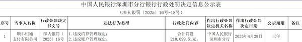 中国人民银行深圳市分行5月9日公示的行政处罚信息显示,顺丰恒通支付有限公司(简称“顺丰支付”)因"违反清算管理规定、违反账户管理规定"两项违规行为,被合计罚没21万元。