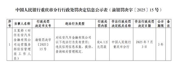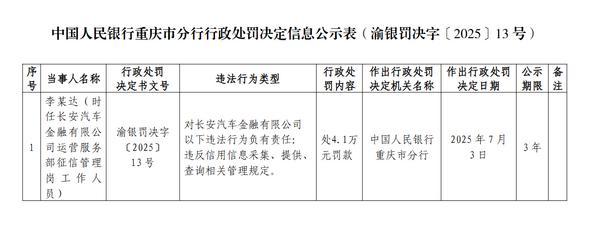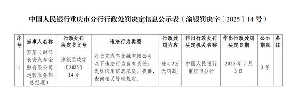 同时,央行重庆市分行对时任长安汽金运营服务部征信管理岗工作人员李某达处4.1万元罚款,对时任长安汽金运营服务部总经理罗某处4.2万元罚款,对时任长安汽金运营服务部征信管理岗工作人员王某娇处4.1万元罚款。以下是相关行政处罚决定信息公示表正文: