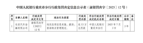 日前,中国人民银行重庆市分行(简称“央行重庆市分行”)公布相关行政处罚决定信息,长安汽车金融有限公司(简称“长安汽金”)因违反信用信息采集、提供、查询相关管理规定,央行重庆市分行对其处53万元罚款。以下是相关行政处罚决定信息公示表正文: