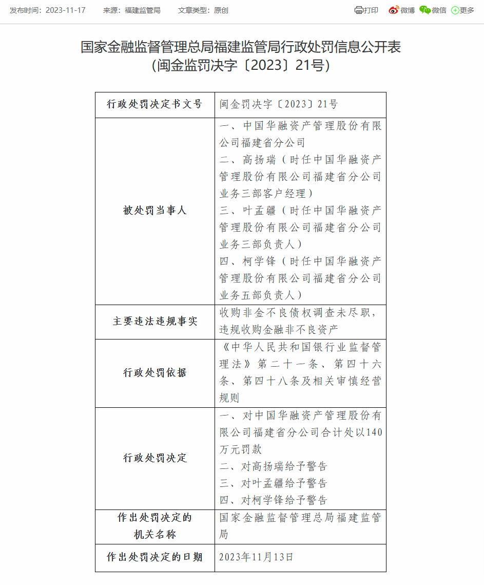 日前,国家金融监督管理总局福建监管局披露行政处罚信息公开表显示,中国华融资产管理股份有限公司福建省分公司因收购非金不良债权调查未尽职,违规收购金融非不良资产,被合计处140万元罚款;作出处罚决定的日期为2023年11月13日。