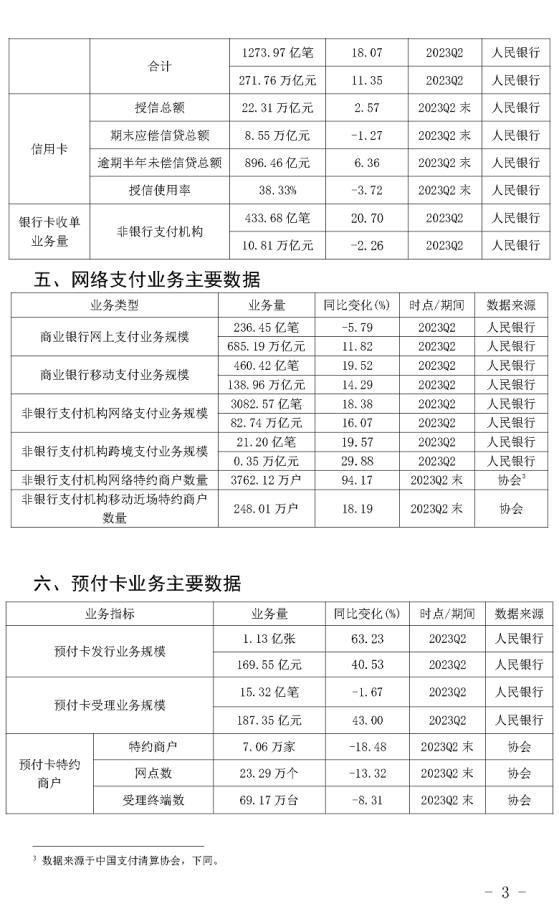 日前,中国支付清算协会2023年第二季度支付清算行业总量指标。数据显示,今年第二季度非银行支付机构网络支付业务规模为82.74万亿元,同比增长16.07%,业务笔数为3082.57亿笔,同比增长18.38%;跨境支付业务规模为0.35万亿元,同比增长29.88%,业务笔数为21.20亿笔,同比增长19.57%。