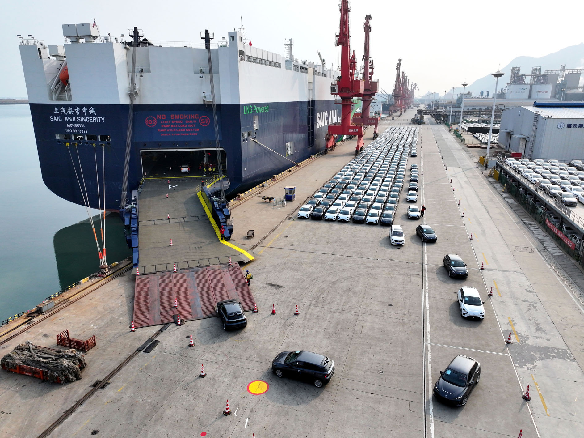 在江苏省连云港港东方港务分公司码头,滚装轮停在泊位上装载出口轿车(无人机照片)。 新华社发(王春 摄)