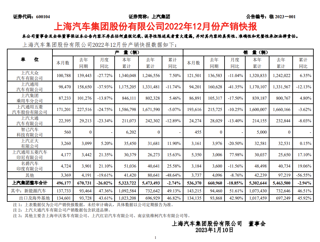 中国网汽车1月10日讯 记者从官方获悉,日前上海汽车集团股份有限公司发布了2022年12月份产销快报,根据数据统计,2022年12月上汽集团整车产量496177辆,销量536370辆,相较2021年同期的660960辆,下滑了18.85%。2022年全年,上汽集团累计销量5302644辆,同比下滑2.94%。