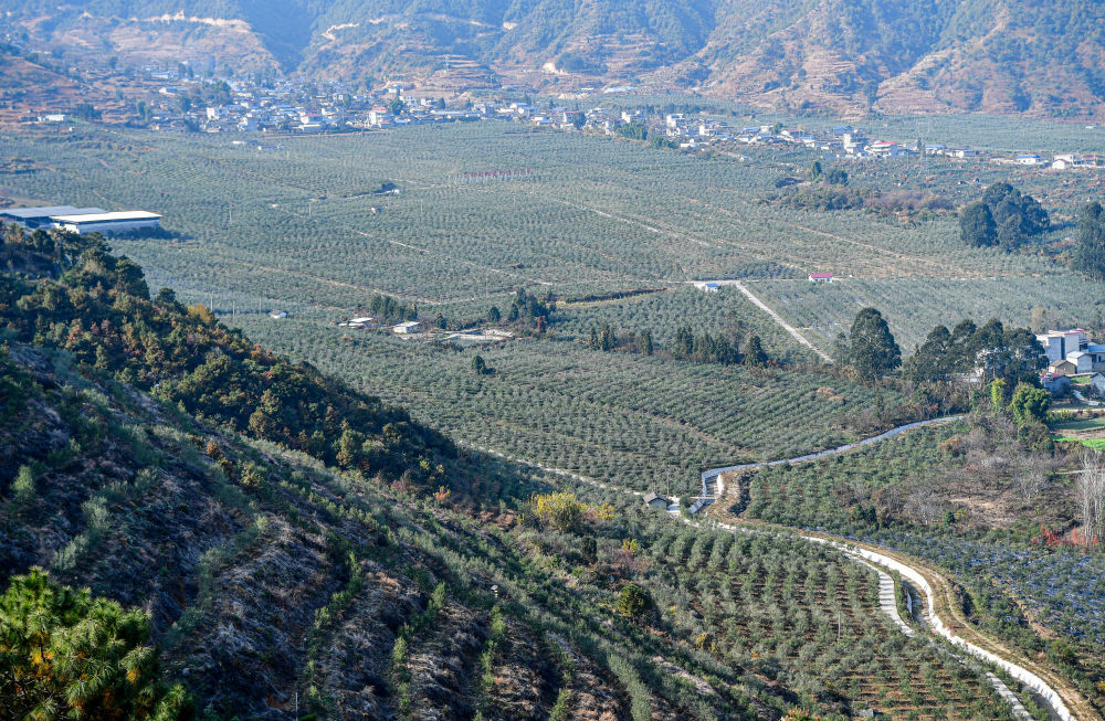在四川冕宁县宏模镇油橄榄现代林业园区里,连片的油橄榄林形成产业规模效应(2024年12月12日摄)。新华社记者 张超群 摄