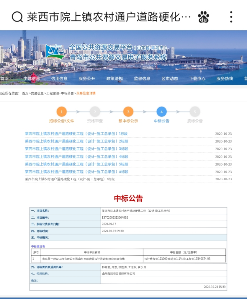 记者通过青岛市公共资源交易网检索获悉,莱西市院上镇2020年9月17日发布农村通户工程招标公告;10月23日发布中标公告,其施工金额97765329.49元;设计金额676300元。资金来源:市财政70%、乡镇30%,该项目共计7个标段,涉及77个行政村,建设单位:院上镇人民政府。