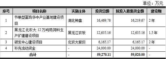 据了解,我国蛋鸡育种企业与国外育种巨头相比大多起步较晚,资金实力不强,在技术积淀、资金实力、硬件投入等方面都存在较大差距,若想与国外老牌育种企业同台竞争甚至实现超越,打通资本市场,实现资本与科技的链接是必然选择!上市融资作为提升育种企业资金实力的有效方式,未来必然成为众多优势种企的优先选择。在政策层面,国家大力支持育种企业做大做强,中央深改委通过的《种业振兴行动方案》强调:“扎实推进种业企业扶优行动,引导资源、技术、人才、资本等要素向重点优势企业集聚”,“以企业为主体,一体化配置资金、人才等要素”,“提高企业融资可及性、便利性。着力培育一批具有较强研发能力、产业带动力和国际竞争力的种业重点龙头企业”。此次,北农大的招股书披露:公司拟募资约5.9亿元,主要用于研发中心、品种扩繁和配套饲料基地的建设。如上述项目投建,必将进一步夯实其蛋鸡育种龙头的地位。