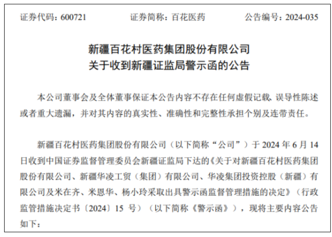 日前,百花医药公告称,公司于6月14日收到新疆证监局出具的行政监管措施决定书(〔2024〕15号)。因在定增申请中存在违规行为,公司及直接控股股东华凌工贸、间接控股股东华凌控股以及实控人米在齐、米恩华、杨小玲等均被出具警示函。