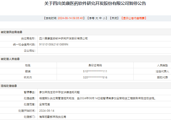 军队采购网近期发布的消息显示,四川美康医药软件研究开发股份有限公司(简称“美康股份”)因参加采购活动中涉嫌违规,根据军队供应商管理相关规定,自2024年8月14日起暂停其参加全军物资工程服务采购活动资格。