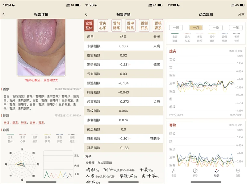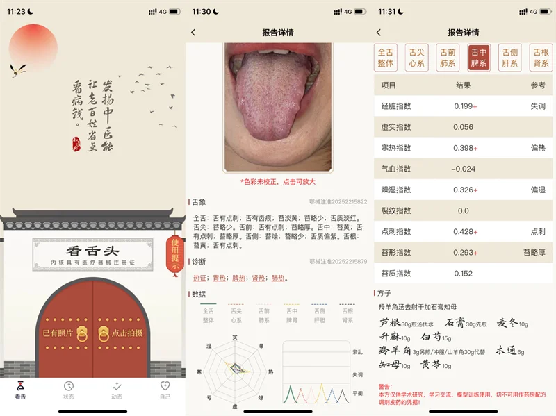 第一次使用“看舌头App”时,我拍了张舌头照片。App界面简洁直观,按照提示调整光线、对准镜头,10秒内就生成了一份详细的分析报告。报告从寒热、虚实、燥湿、亏滞四个维度,结合肝、心、脾、肺、肾五行系统,清晰解读了舌头颜色、形态、裂纹背后的健康密码。更让我惊讶的是,它不仅指出我“胃热、肺热”的体质特点,还给出了参考调理方子,甚至具体到每种药材多少克。