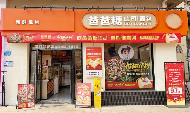 本次合作主题围绕“吃爸爸糖吐司 看熊猫喜剧”,打造多维度联动场景,覆盖线上线下各渠道。线下,爸爸糖除了在全国门店的电视机滚动播放联名官宣视频和海报外,还精心筛选数家重点门店打造电影主题店。其中位于重庆的主题快闪店尤为引人注目,门店深度融合《熊猫计划之部落奇遇记》电影元素与春节氛围,让消费者在品尝美味吐司的同时,沉浸式感受电影的欢乐气息,打造春节期间亲子打卡、休闲欢聚的新坐标。