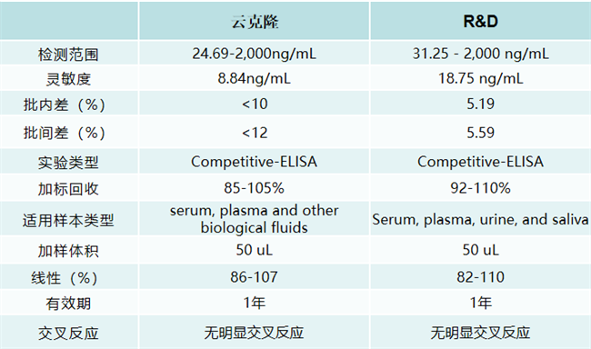 图2. 云克隆丙二醛ELISA试剂盒与R&D对应产品技术参数比较(数据来源,云克隆、R&D官网)