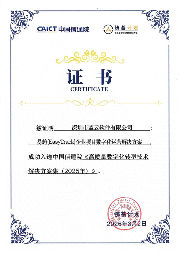 易趋是深圳市蓝云软件有限公司旗下核心产品,深耕项目管理领域二十余年,融合 PMBOK、PRINCE2、CMMI、IPD、敏捷等国际主流管理方法论,以全生命周期项目运营为核心,打造端到端数字化管理闭环,已服务深交所、邮储银行、京东方、海尔、中广核、中国移动等众多行业头部企业,覆盖金融、IT、高科技制造、汽车、能源、科研等多个领域。