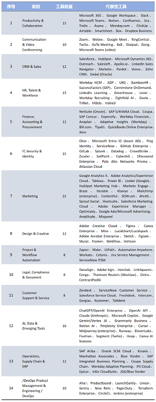 注:以上合计175款SaaS应用只是代表性样本,若包含垂直/行业特定工具,财富500强企业的应用栈往往超过300款。