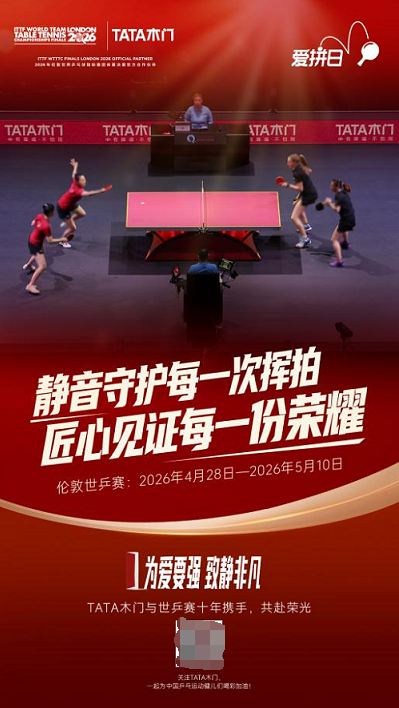 TATA木门在本次“爱拼日”活动中,将围绕伦敦世乒赛打造一系列国际化传播活动,以创新形式展现品牌实力与中国智造魅力。品牌将在赛事现场设置创意宣传装置,直观呈现产品设计与工艺实力;并重磅登陆温布利场馆地标大屏,以“中国第一,走到哪里都是第一”实现全球亮相,同时联动北京、上海、成都、沈阳等国内多城地标大屏同步点亮,声援国乒健儿,打造海内外呼应、线上线下共振的传播声势,让“中国门”的声音响彻国际舞台。