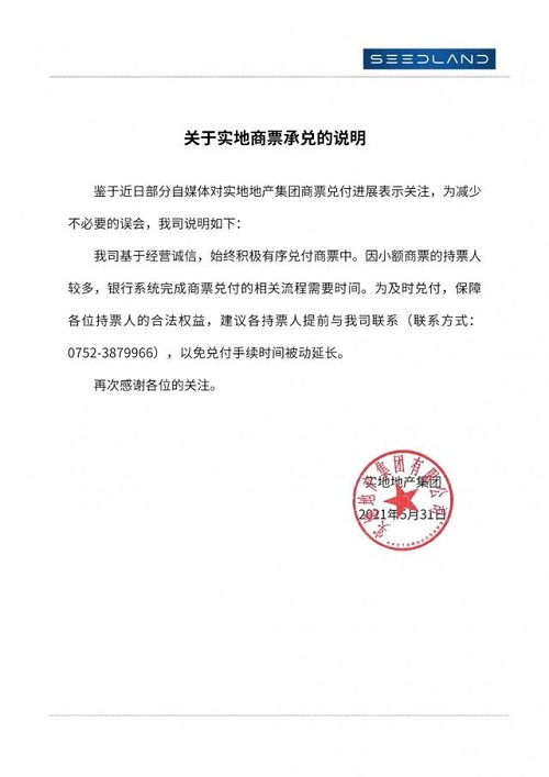 中国网财经5月31日讯 实地地产官网今日发布《关于实地商票承兑的说明》,说明指出,鉴于近日部分自媒体对实地地产集团兑付进展表示关注,为减少不必要的误会,作出如下说明: