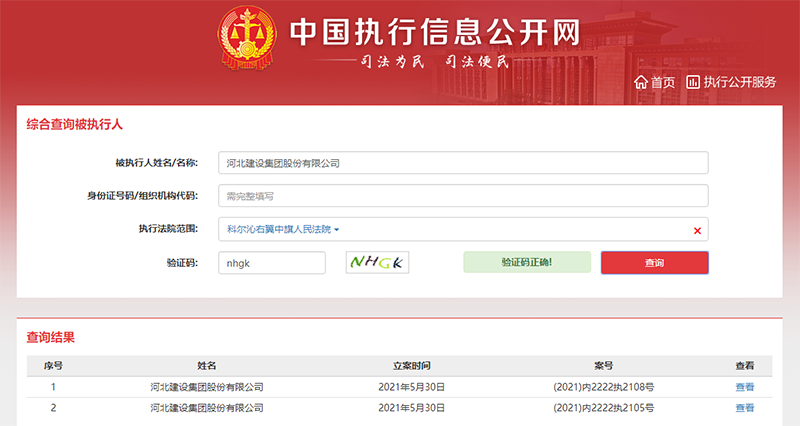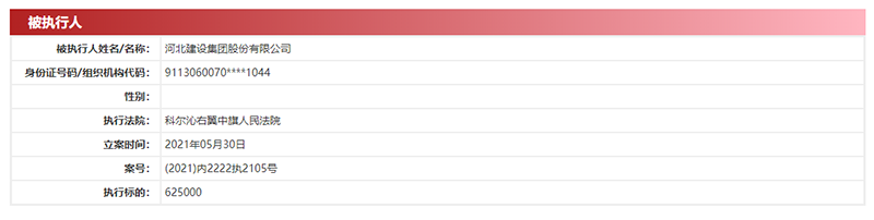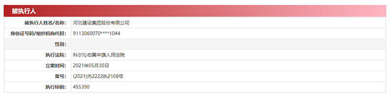 中国网财经5月31日讯(记者 钟文鑫)据中国执行信息公开网,近日,河北建设集团股份有限公司新增两条被执行信息。案号为(2021)内2222执2105号和(2021)内2222执2108号的两条执行信息显示,科尔沁右翼中旗人民法院5月30日两次将河北建设集团股份有限公司列为被执行人,执行标的总额1080390元。