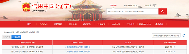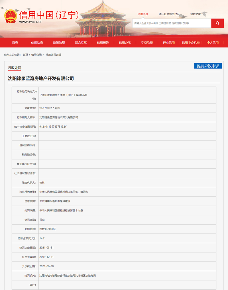 中国网财经4月14日讯 信用中国(辽宁)网站4月12日公示的两则行政处罚信息显示,沈阳锦泉蓝湾房地产开发有限公司因未取得中标通知书擅自建设、未取得监理单位中标通知书擅自建设,违反《中华人民共和国招标投标法》(以下简称《招投标法》)第三条、第四条,于2021年3月31日被沈阳市城市管理综合行政执法局沈北新区执法分局依据《招投标法》第四十九条罚款共计14.36万元。