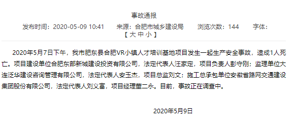 中国网财经5月9日讯 合肥市城乡建设局今日发布的事故通报显示,5月7日下午,肥东县合肥VR小镇人才培训基地项目发生一起生产安全事故,造成1人死亡。