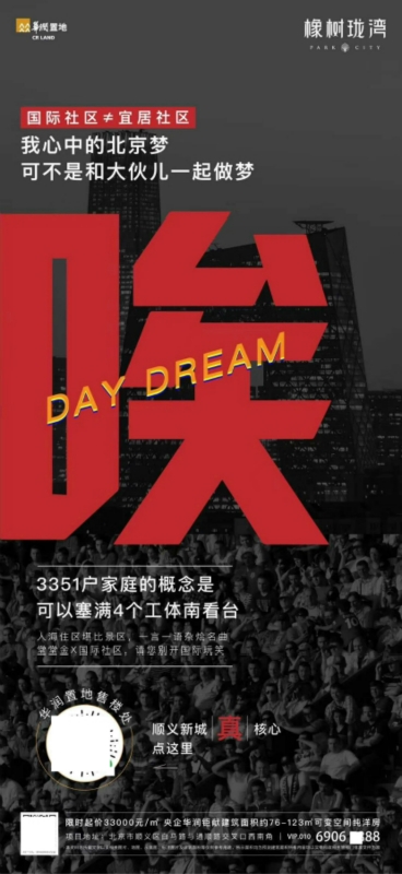 “唉”这张图片上,有“DAY DRRAM”(注:白日梦)的英文字样,称“国际社区≠宜居社区”“我心中的北京梦 可不是和大伙儿一起做梦”,“3351户家庭的概念是可以塞满4个工体南看台”,“人海住区堪比景区,一言一语杂烩名曲”。