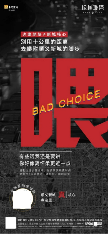 “喂”这张图片,疑似是戏谑“金X国际社区”位置欠佳,“边缘地块≠新城核心”,“别用十公里的距离去攀附顺义新城的脚步”。图片上称,“有些话我还是要讲,你好像离怀柔更近一点”,“通勤往返步履维艰,物资采买耗费时间”。