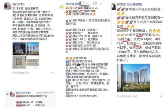 此外,记者发现,开发商给到中介的宣传资料中存在“卖点5:成都市第一人民医院,天府新区人民医院医疗机构均在车程20分钟以内”的描述,玛雅房屋中介人员销售世纪星时发布朋友圈称“6号线11号线站距离项目约1200米,步行15分钟内即可到达”。《房地产广告发布规定》第四条规定,房地产广告,房源信息应当真实,面积应当表明为建筑面积或者套内建筑面积,并不得含有以项目到达某一具体参照物的所需时间表示项目位置。上述描述涉嫌违反该规定。
