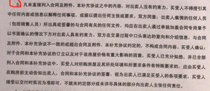 业主提供的《南阳御龙府二期商品房买卖合同补充协议》(下称“《补充协议》”)第五条显示,凡未直接列入合同及附件、本补充协议之中的内容,对出卖人没有约束力,买受人不得授引其中任何内容或信息以解释任何事项,或据以提出任何主张或要求。