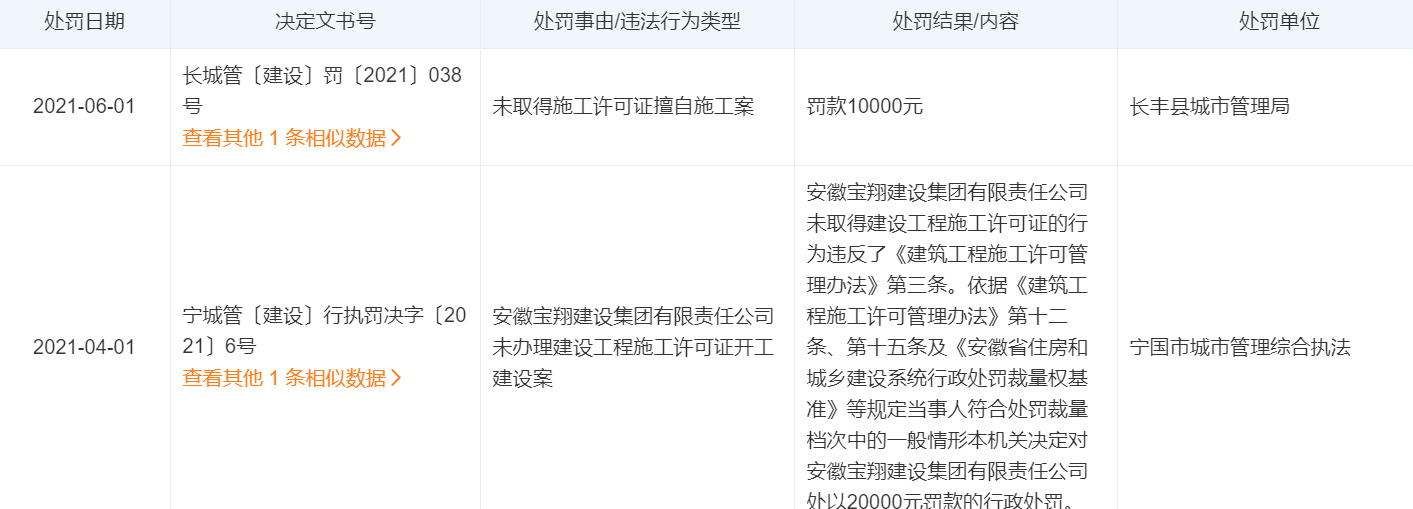 中国网财经注意到,今年以来,安徽宝翔建设集团有限责任公司已多次被相关部门处罚。