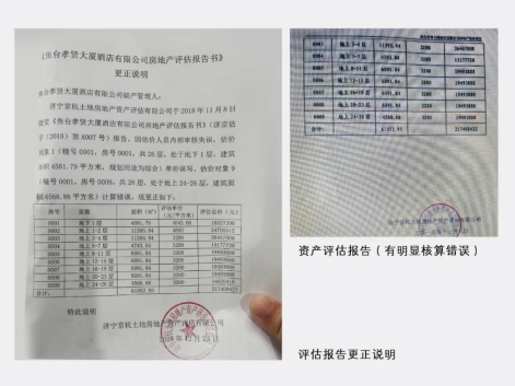 此外,据评估报告的第6页显示:“地上24-26”楼层,面积4568.88平方米,单价为3200元每平方米,总价约1949.4万元,计算明显错误,之后又于2018年12月23号作出更正申明。如此不严谨的估值错误,加深了债权人对资产管理人(公明政和律师事务所)的质疑:“缘何对关系到每个有财产担保的债权人切身利益的数字都不进行复核就直接公布,其他资产估值是否也存在不严谨的错误?”