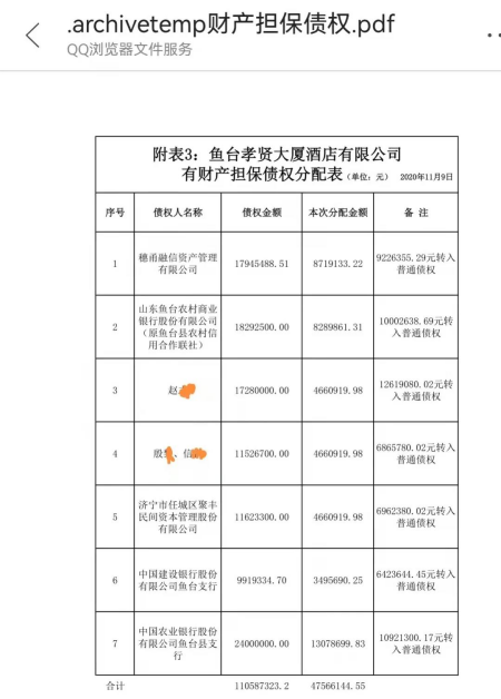 据悉,公司法人主体为鱼台孝贤大厦酒店有限公司,成立于2010年6月28日,后因资金不足,于2015年4月宣告破产清算,债务涉及民间借贷、银行贷款、建筑工程款、房屋买卖合同,遂引发债权分配纷争。