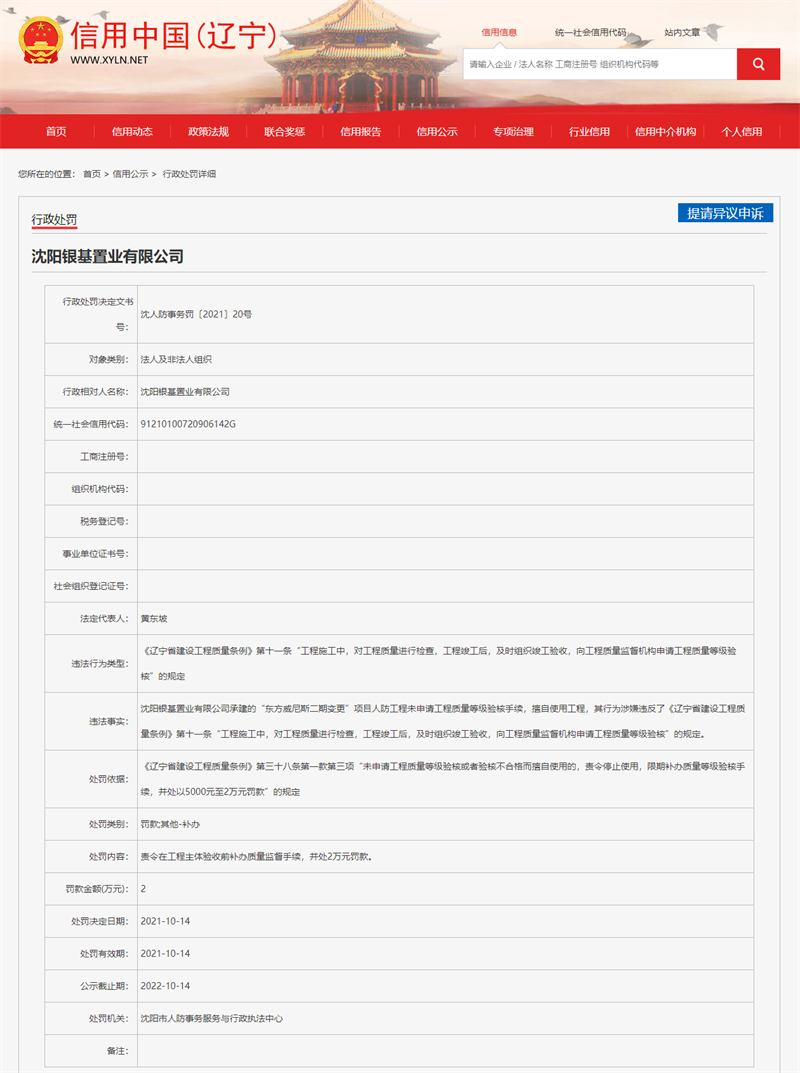 中国网财经10月15日讯(记者 钟文鑫)信用中国(辽宁)网站10月14日公示的一则行政处罚信息显示,沈阳银基置业有限公司因承建项目的人防工程未申请工程质量等级验核手续擅自使用,涉嫌违反了《辽宁省建设工程质量条例》相关规定,被沈阳市人防事务服务与行政执法中心罚款2万元,处罚决定日期为2021年10月14日。