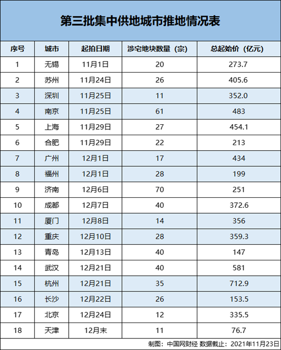 中国网财经11月24日讯(见习记者 甘承浩)23日,天津第三次集中土拍的11宗涉宅地块挂牌,起始总价约76.7亿元。至此,全国22个集中土拍城市中已有18个城市公布三批次土拍具体细则。