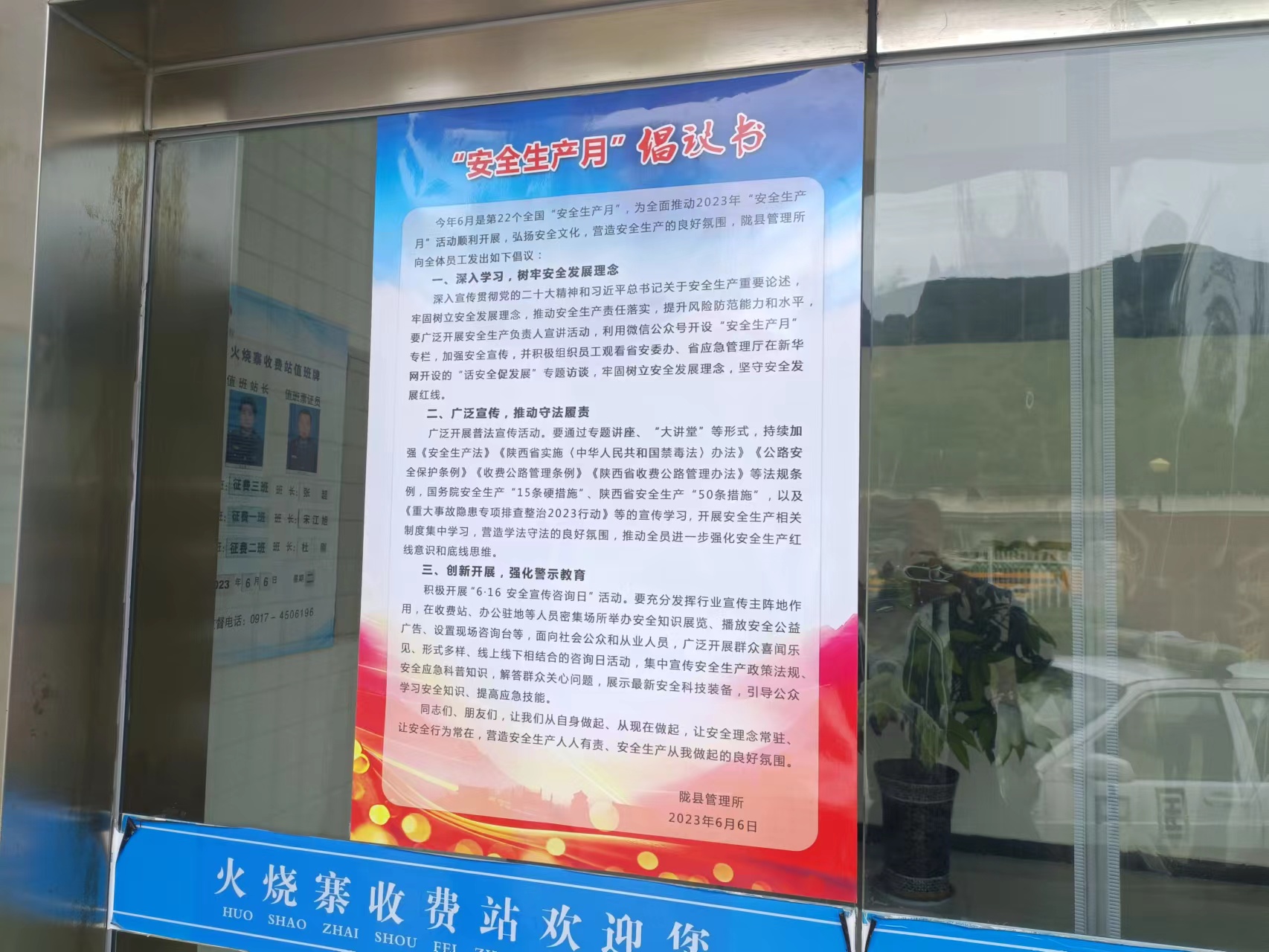 广泛宣传,营造氛围。陕西交控宝鸡分公司陇县管理所火烧寨收费站在收费现场开展形式多样的安全宣传活动,设立宣传板报,张贴宣传海报、悬挂横幅、LED屏滚动播放安全生产宣传标语等,并积极向过往司乘发放安全宣传单,提升全民安全意识,营造浓厚的安全宣传氛围。