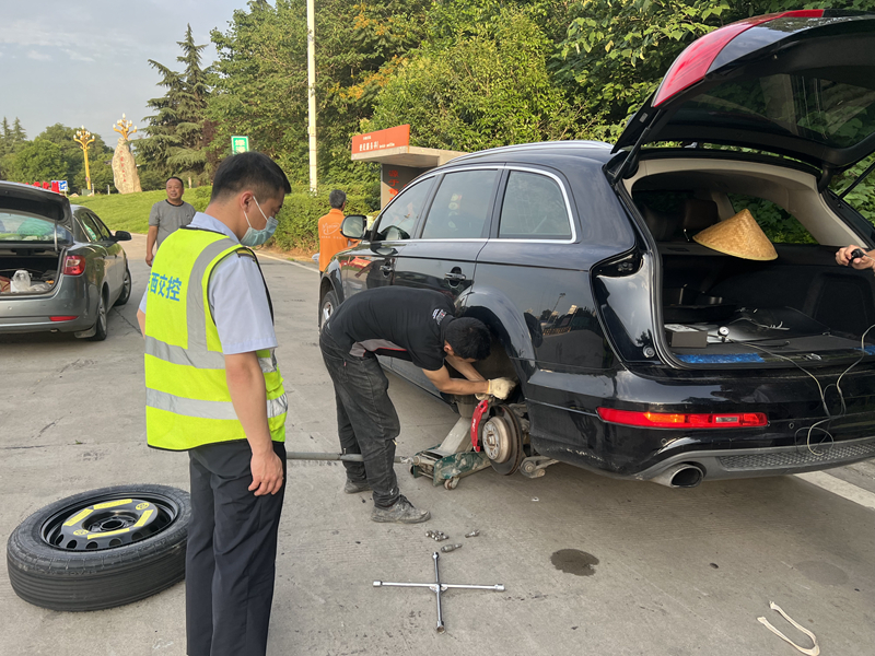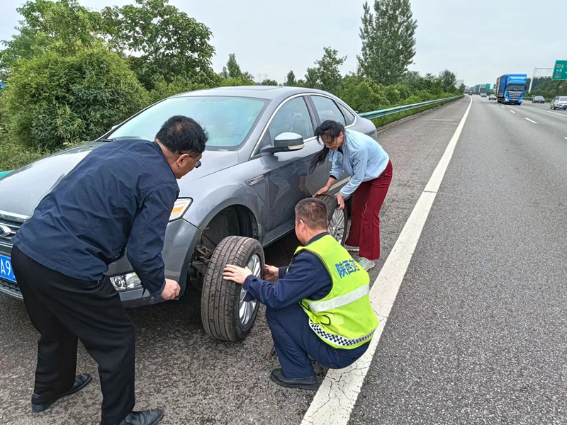 6月8日上午,连霍高速西潼段路产巡查人员巡查至潼关方向K916+850处时,发现一辆蓝色小轿车停在应急车道,巡查人员下车后找到司机了解情况,原来是该车辆的左前轮爆胎,夫妻两人表示不会更换轮胎,车上也没有更换的工具,心里很着急。得知情况后,巡查人员迅速在车后安全距离处设置了警戒区域,提醒后方车辆注意避让,主动帮助车主更换了备胎。经过10多分钟的努力,轮胎顺利换好,受困司机满怀感激的再次踏上了征途。