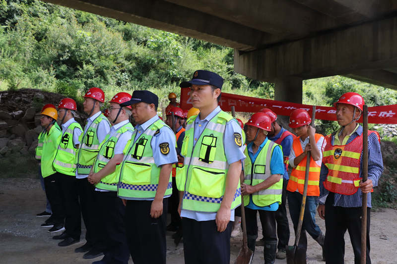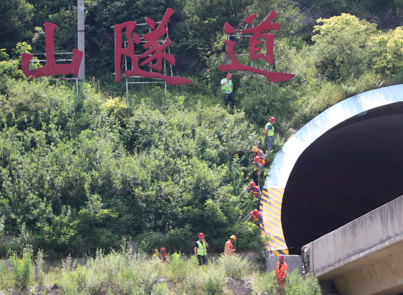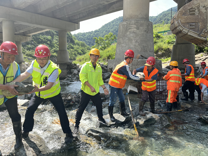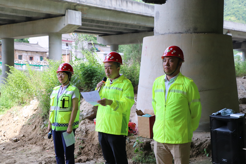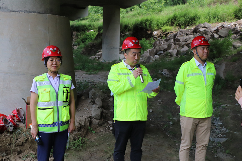 此次演练模拟因持续降雨,河道水位快速上涨,导致K1467+897灞河4号大桥3-1号墩桩基外漏2米受冲刷严重,曹家山隧道洞顶仰坡有石块掉落至河道中,严重影响道路安全运行。按照演练方案,在接到险情汇报的第一时间,防汛抢险领导小组立即启动防汛应急预案,紧急调集抢险人员及设备奔赴事发现场开展抢险工作,同时安排安全路产人员配合交警进行临时交通管制。应急抢险队在到达汛情现场后立即进行分工,分别对受损墩柱、隧道洞顶坡体稳定性进行排查,对外漏桩基进行保护加固处理,同时对隧道洞顶危石进行清理,经过近50分钟的抢险作业,经过现场人员评估,确定水毁现场安全隐患已全面排除,道路恢复正常通行,演练结束。