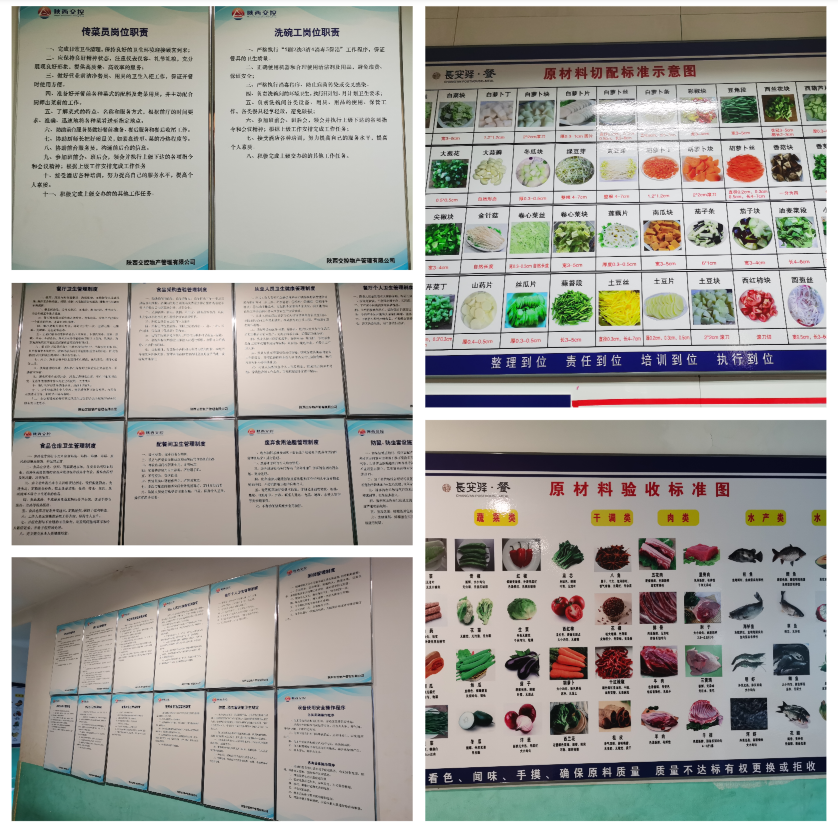 制作上墙制度,规范加工流程。认真梳理两店关于餐饮方面的各项制度,对于不适用的及时进行改进和细化,并在食材加工间、食品仓库等重要位置“上墙”《食品采购查验管理制度》《冷藏(冻)设施卫生管理制度》《食品仓库卫生管理制度》《废弃食用油脂管理制度》等十余项制度,并“上墙”原材料验收标准图,把控好采购查验、储存、加工、卫生等各个环节,从制度、标准上助力餐饮规范化管理水平提升。