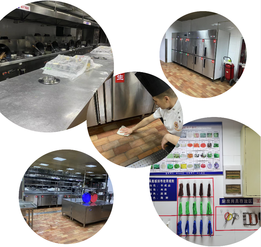物品分类存放,美化加工环境。开展餐饮环境卫生大整治活动,在操作间醒目位置张贴餐饮管理十条、刀具案板抹布使用规则、菜品切配标准等公示牌,并设立厨房用具存放区,不断优化操作间物品的分类存放和加工切配工作,实现良好工作环境。同时做好环境卫生工作,要求餐饮人员每天做好食品操作间、餐厅各个位置的环境卫生清理和消杀工作,每周由安全运营部牵头,做好卫生保持情况的检查工作,确保环境卫生干净整洁,从卫生上助力餐饮规范化管理水平提升。