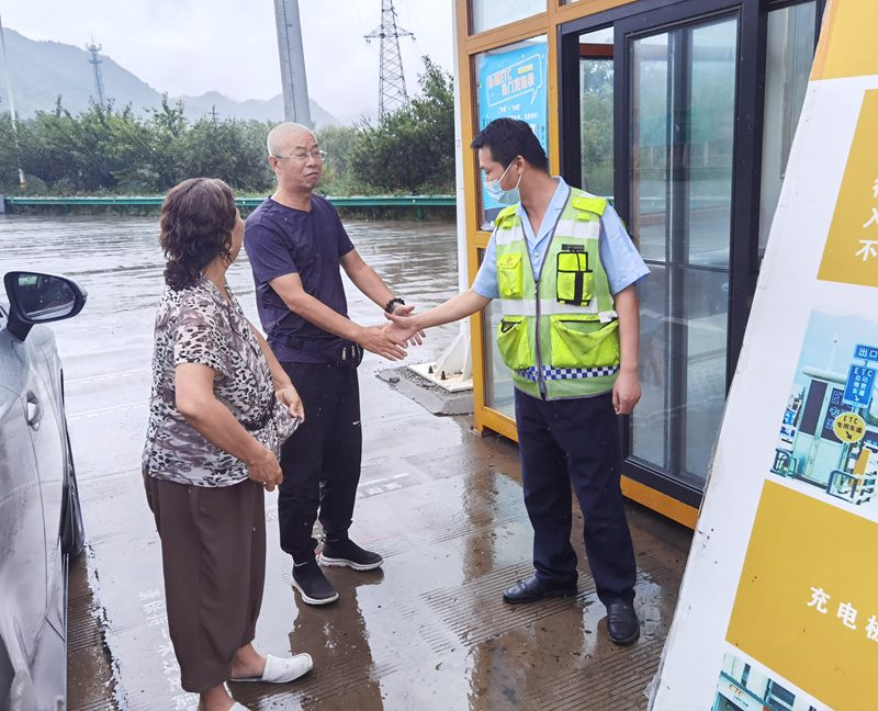《国企》融媒陕西讯(赵政) 2023年7月13日上午,灞源山区突降暴雨,陕西交控西商分公司灞源收费站外勤人员唐瑶远远看到一位女士正从高速匝道往收费站走来,没有撑伞,而且走的十分缓慢。由于雨势较大,加之身边是呼啸而过的车辆,情况十分危险。唐瑶见状,迅速为该女士送去雨伞,看到女士脚上穿的是一次性拖鞋,已经全部湿透,情绪也十分低落,唐瑶一边安抚其情绪,一边搀扶着她到便民服务亭休息。