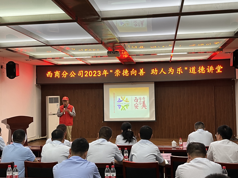 《国企》杂志融媒陕西讯(车丽玲) 为不断把学习贯彻习近平新时代中国特色社会主义思想引向深入,大力弘扬社会主义核心价值观,全面提升职工道德素养,充分激发职工崇德向善的热情,7月27日,以“崇德向善 助人为乐”为主题的陕西交控西商分公司2023年第二期道德讲堂活动正式开讲。西商分公司领导班子成员、蓝田东管理所干部职工代表共60余人参加本次活动。
