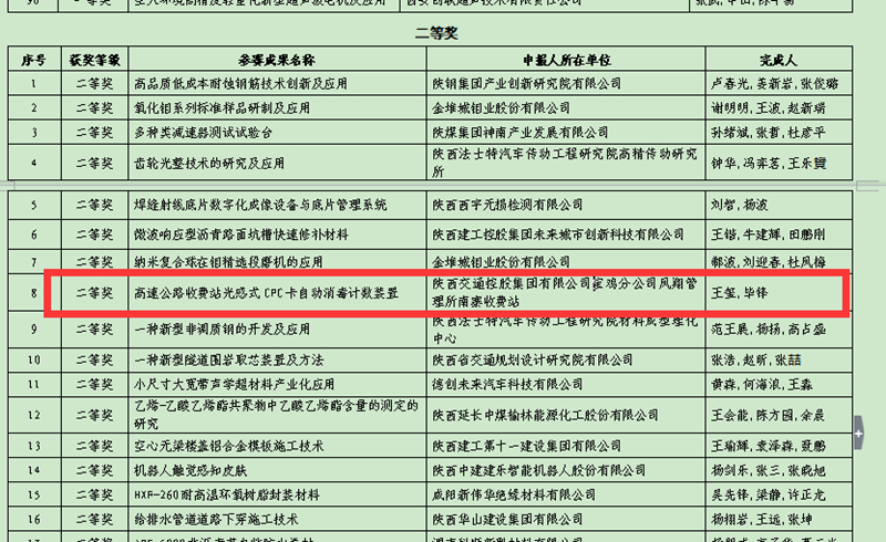 《国企》杂志融媒陕西讯(毕锋) 近日,由陕西省科协、省工信厅、省国资委、省工商业联合会联合主办的2023年陕西省企业“三新三小”创新竞赛评审结果揭晓。由陕西交控宝鸡分公司凤翔管理所南寨收费站申报的《高速公路收费站光感式CPC卡自动消毒计数装置》获评2023年陕西省企业“三新三小”创新竞赛二等奖。