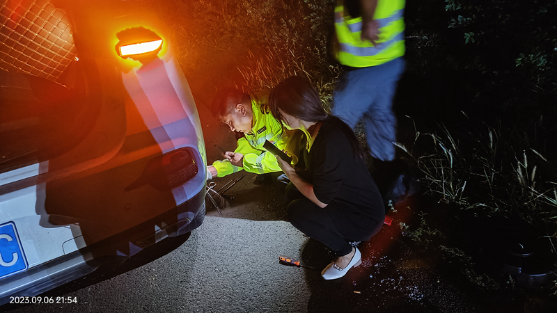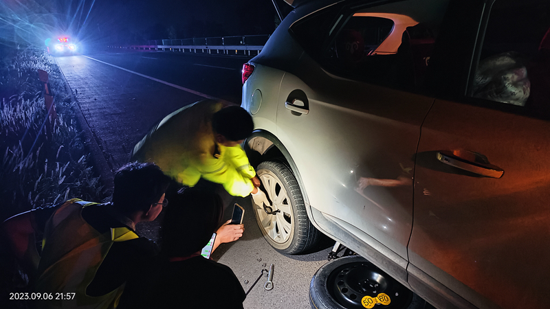 《国企》杂志融媒陕西讯(马瑜) 9月7日1:20分,陕西交控绥定分公司靖边管理所安全路产巡查人员巡查至下行K1259+100m处,发现一辆小轿车停在应急车道上打着双闪,巡查人员立即靠边停车查看情况,经询问得知,该驾驶员在高速公路上行驶时,突然车辆右后轮胎爆胎,司机不会更换轮胎,加之夜间行车灯光视线不足,正急的到处联系救援。巡查人员立即开始默契行动,一名巡查人员迅速在故障车辆后方200m处摆放专用声光报警器及其他安全警示标志做好警示工作,避免发生二次事故;另一名巡查人员从巡逻车上取出工具帮助车主更换轮胎,十几分钟后轮胎就更换好了,司机带着感激的心情踏上归程。