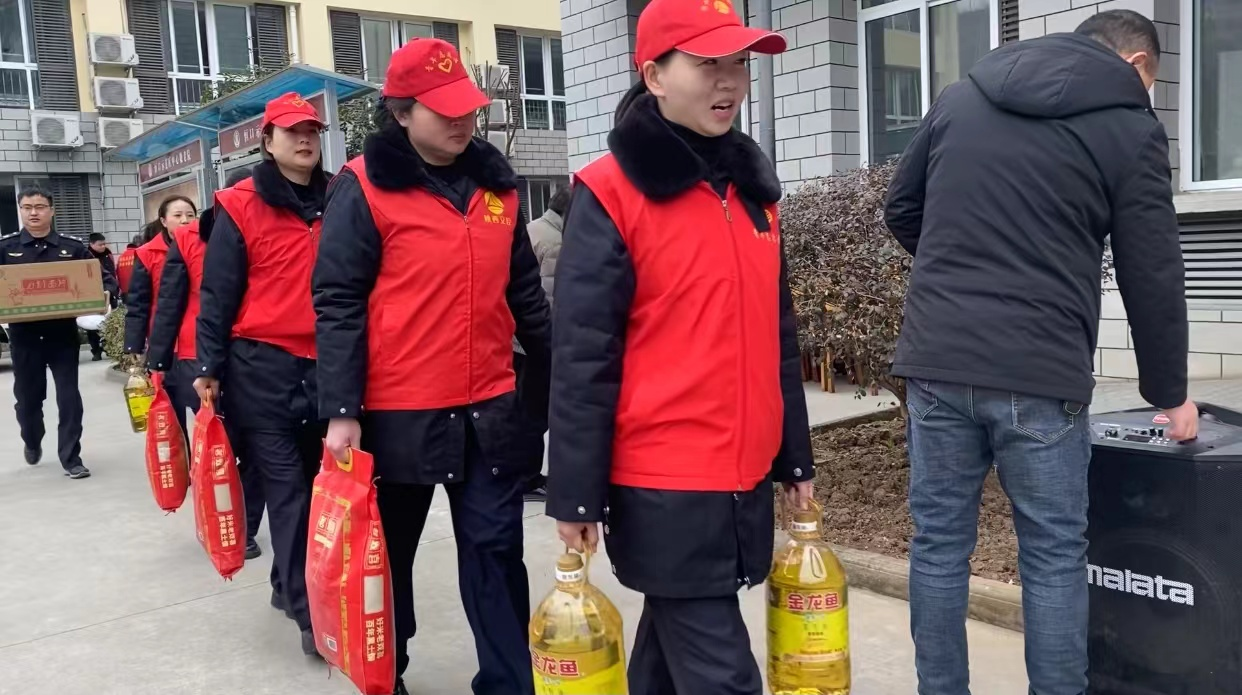 在敬老院院长的引导下,志愿者一行走进敬老院,围绕爱心捐赠、温情抚慰、暖心陪伴、环境整洁等4方面重点内容开展关爱服务:为老人爱心捐赠米、面、油等生活用品,并为老人送上精彩文艺节目。