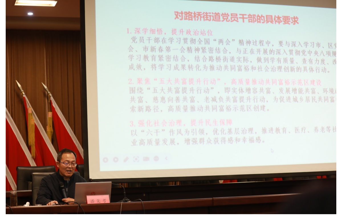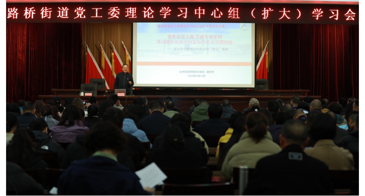 《国企》杂志融媒浙江讯(党建好故事 江 风)2025 年全国“两会”为乡村振兴与共同富裕注入了强大动力。3 月 31 日晚,台州市路桥区路桥街道迅速行动,召开专题学习会,掀起学习贯彻“两会”精神的热潮。台州开放大学正校级领导、台州农民学院执行副院长潘先考以“凝聚奋进力量 共建幸福家园”为主题,结合路桥实际,深入解读政策、分享实践经验,为路桥街道全体班子成员、机关干部、综合行政执法队工作人员、村社书记、经济合作社董事长、村社分管组织宣传班子成员等 120 余人带来一场理论与实践交融的“思想盛宴”。这场历时三个小时的讲座,不仅是对“两会”精神的深刻领悟,更是路桥街道以“三个高地”建设为抓手,探索共同富裕与社会治理创新的生动实践。路桥街道党工委书记汪平兴主持专题讲座,台州开放大学路桥学院院长陈秀蓉、副院长江浴参加专题讲座。