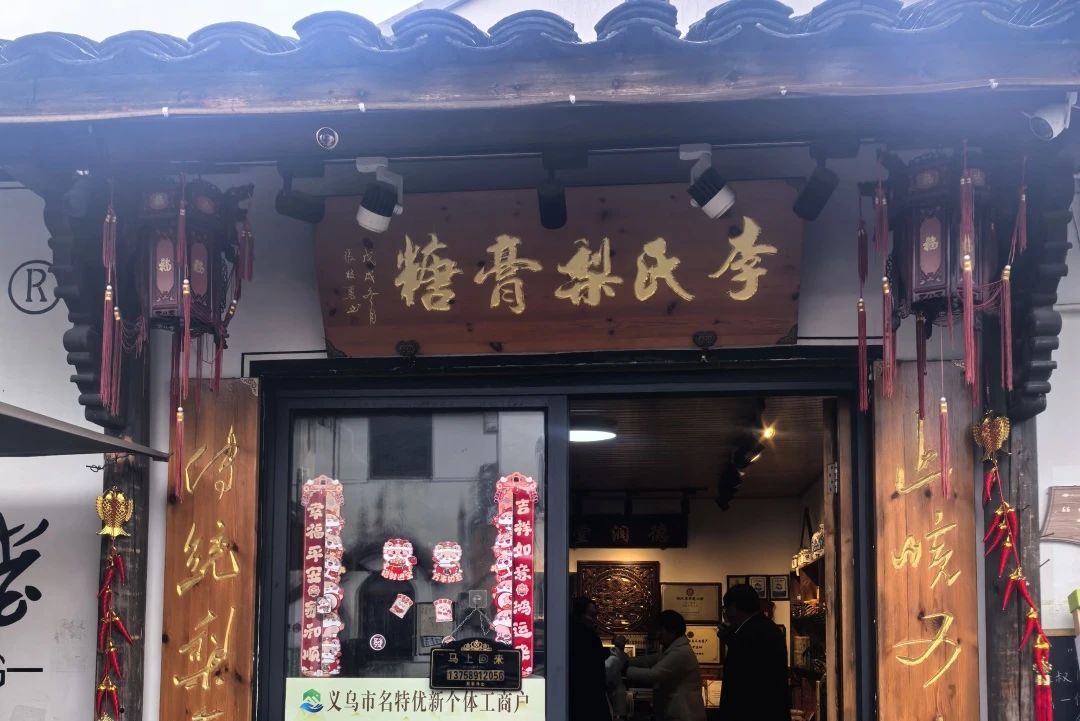 一块“李氏梨膏糖”的匾牌挂在门顶,“止咳可化痰,传统梨膏糖”,朴实的对联,吸引了人们的眼球。梨膏糖由来已久,这一传统产品保存下来实在难得。我记得小的时候,有一次咳嗽难缠,刚好一副货郎担来到村前,奶奶用鸡毛换来几块梨膏糖,觉得既爽口又甜味,想不到睡了个夜晚咳嗽就好了。